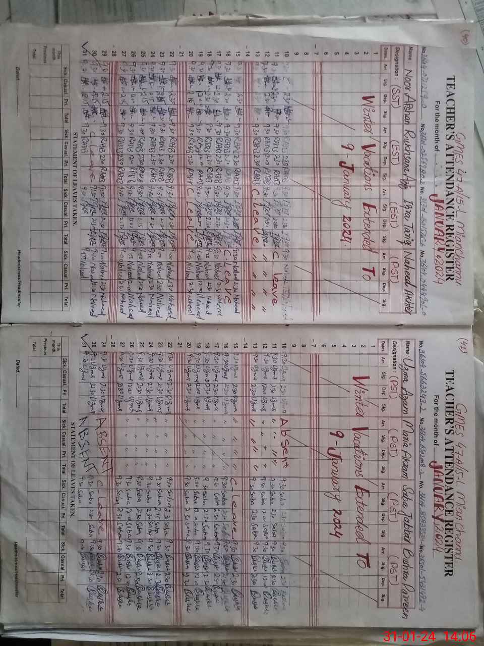 | Remarks (Use Separate Page if Required): MARIA AKRAM PST FOUND ABSENT FROM DUTY FROM 10 JANUARY 2024 TO TILL FOUR TOILETS FOUND LOCKED AND NON FUNCTIONAL RANDOM CLASS TWO IS NOW IN CLASS FOUR | |||||