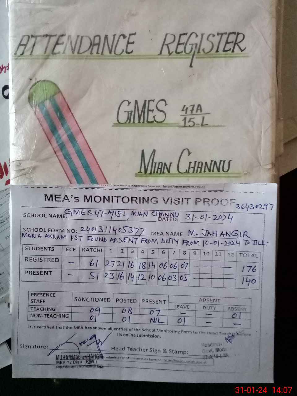 | Attendance Register | Head Teacher | MEA with School | Visit Proof |