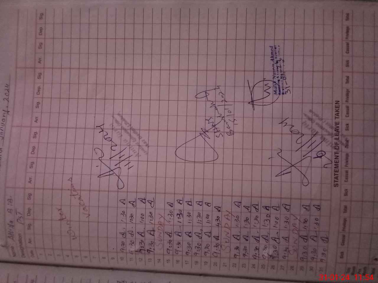 | CNIC | Full Name | Designation | R/C | Absence During Last Calender Month |
