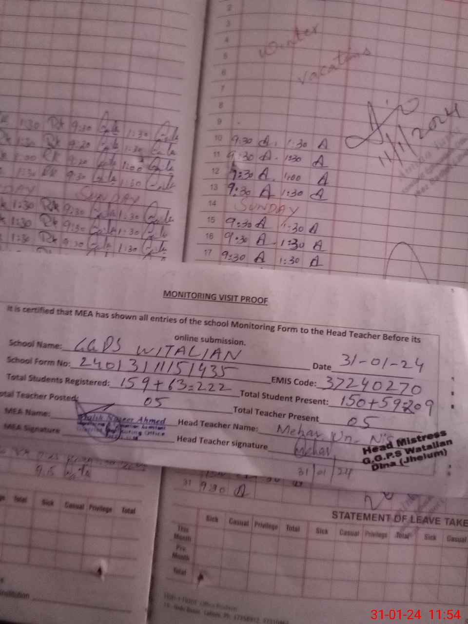 | Attendance Register | Head Teacher | MEA with School | Visit Proof |