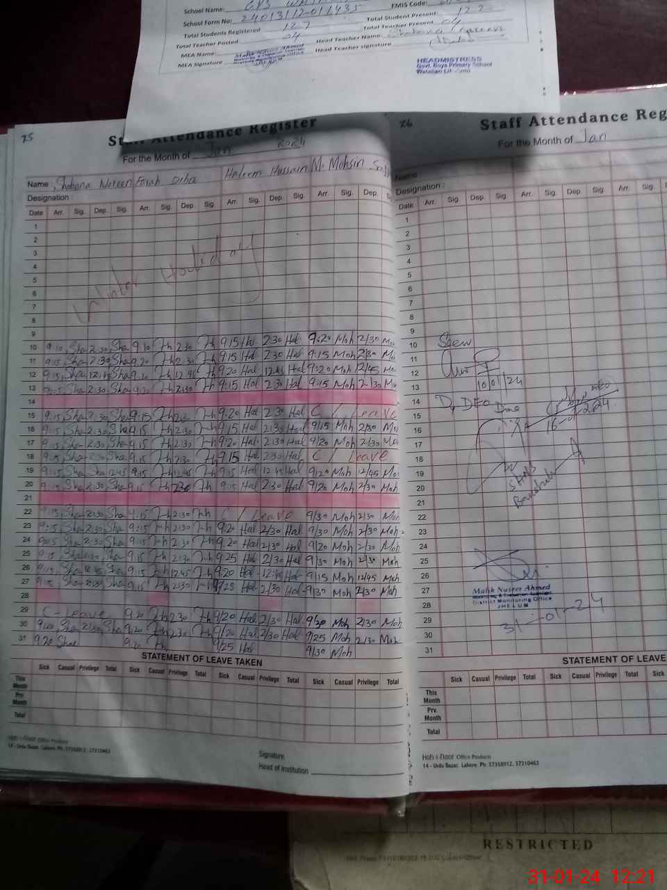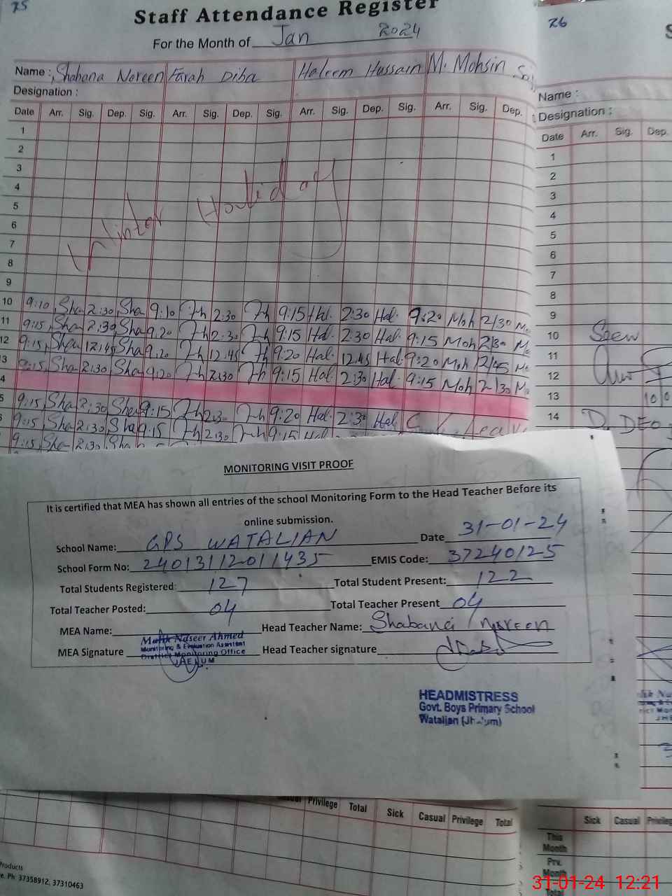 | Attendance Register | Head Teacher | MEA with School | Visit Proof |