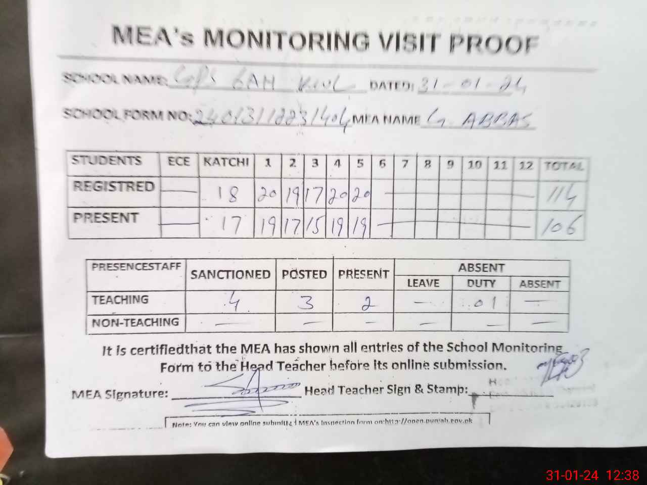 | Attendance Register | Head Teacher | MEA with School | Visit Proof |