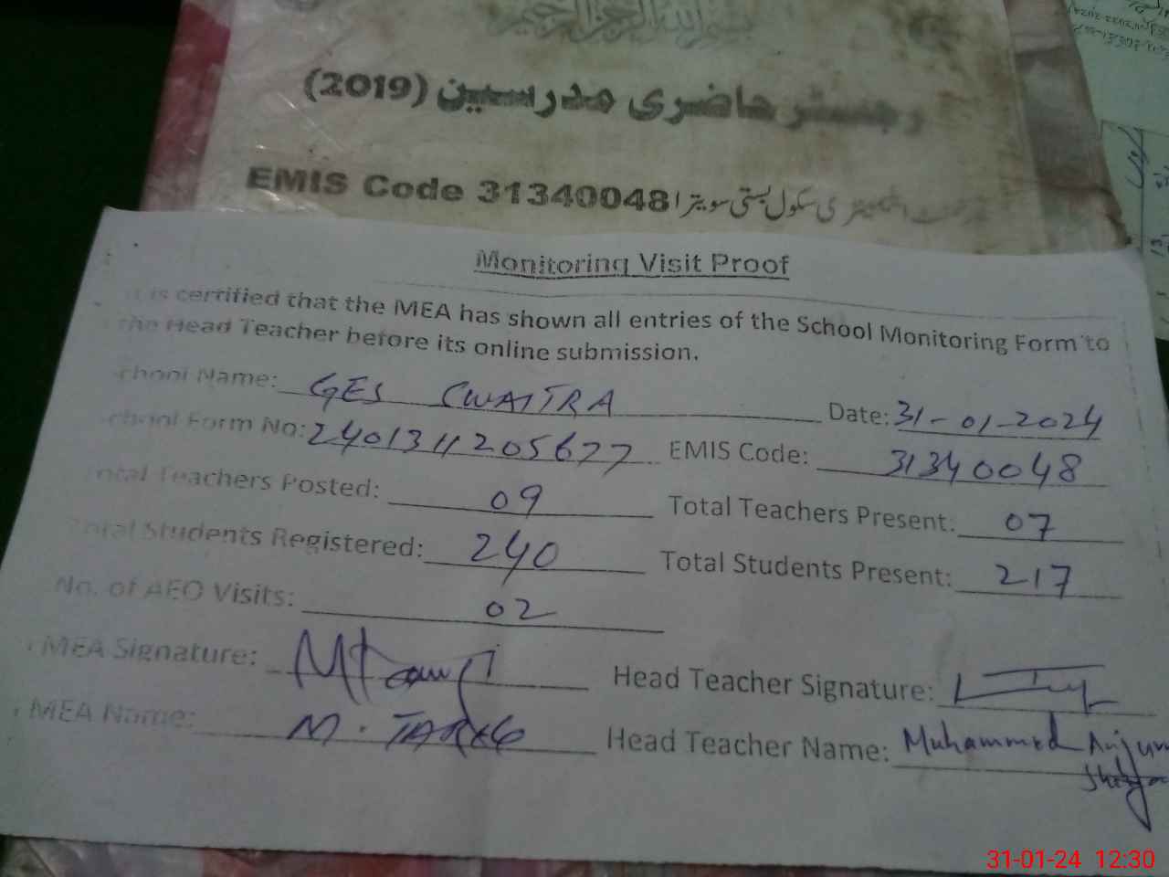 | Attendance Register | Head Teacher | MEA with School | Visit Proof |
