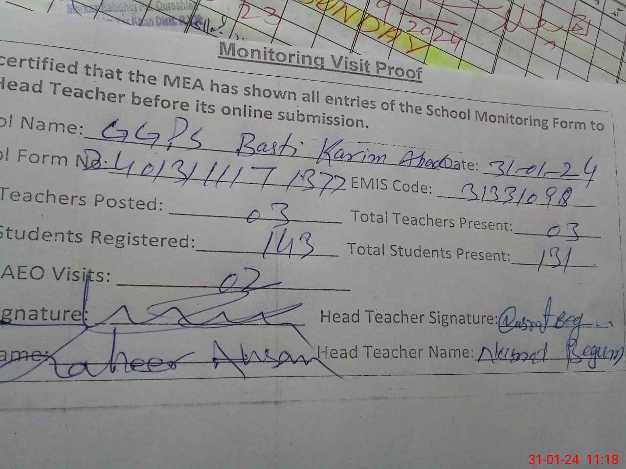 | Attendance Register | Head Teacher | MEA with School | Visit Proof |