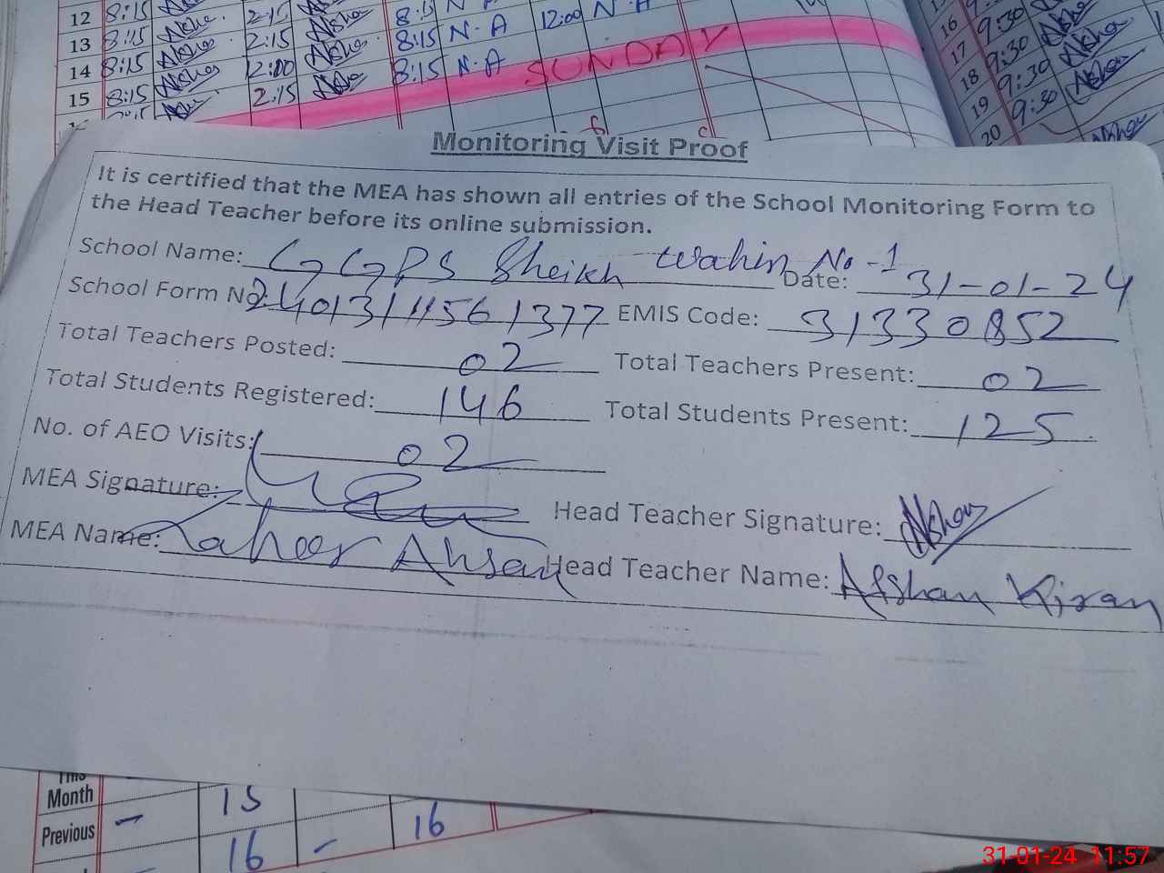 | Attendance Register | Head Teacher | MEA with School | Visit Proof |
