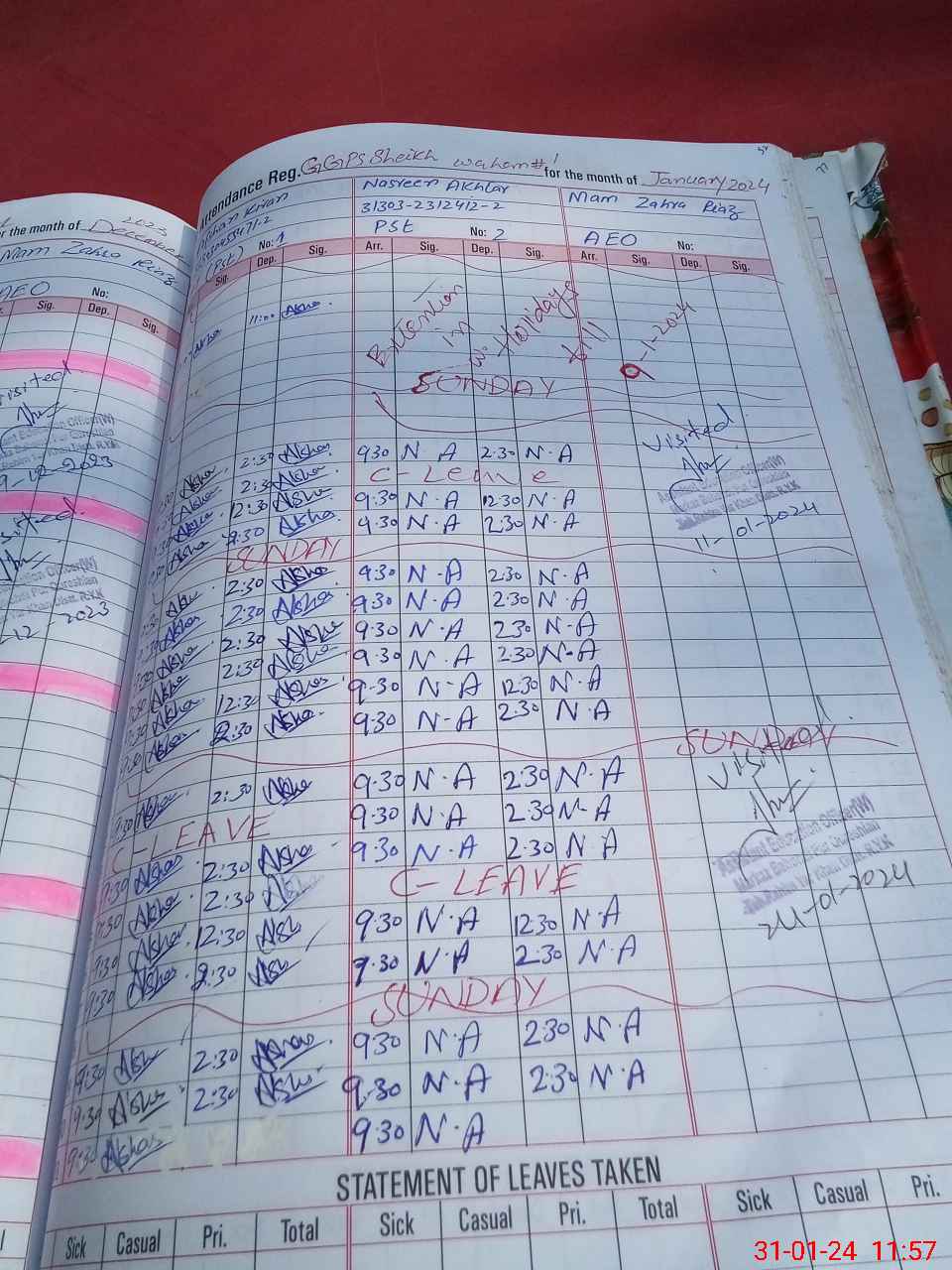 | CNIC | Full Name | Designation | R/C | Absence During Last Calender Month |