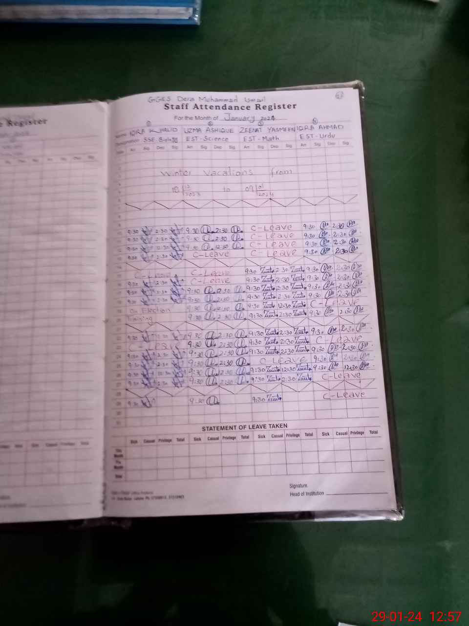 | Leave | Duty | Absent | Maternity | Medical | Ex- Pak |