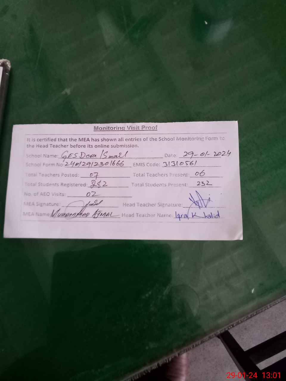 | Attendance Register | Head Teacher | MEA with School | Visit Proof |