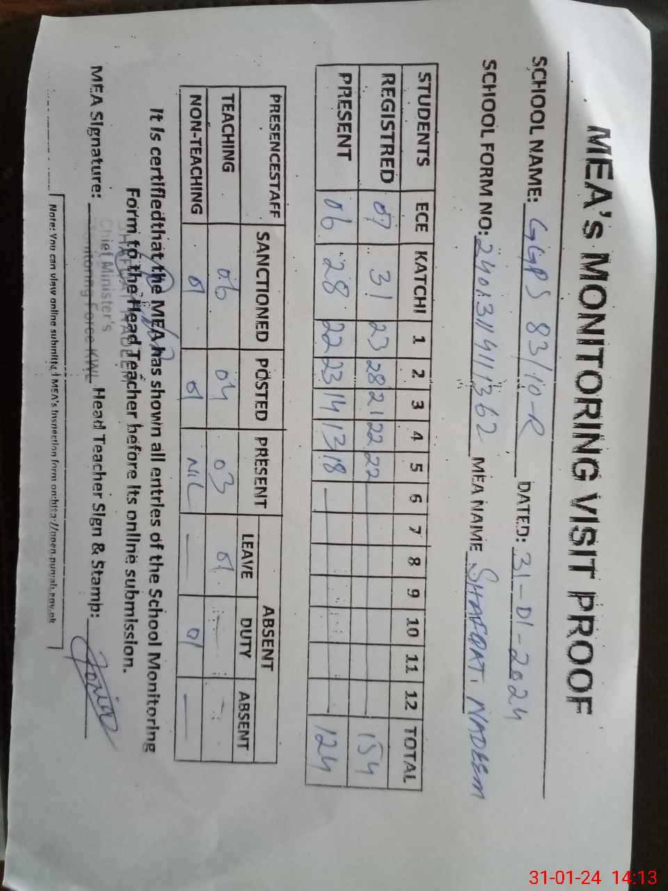 | Attendance Register | Head Teacher | MEA with School | Visit Proof |