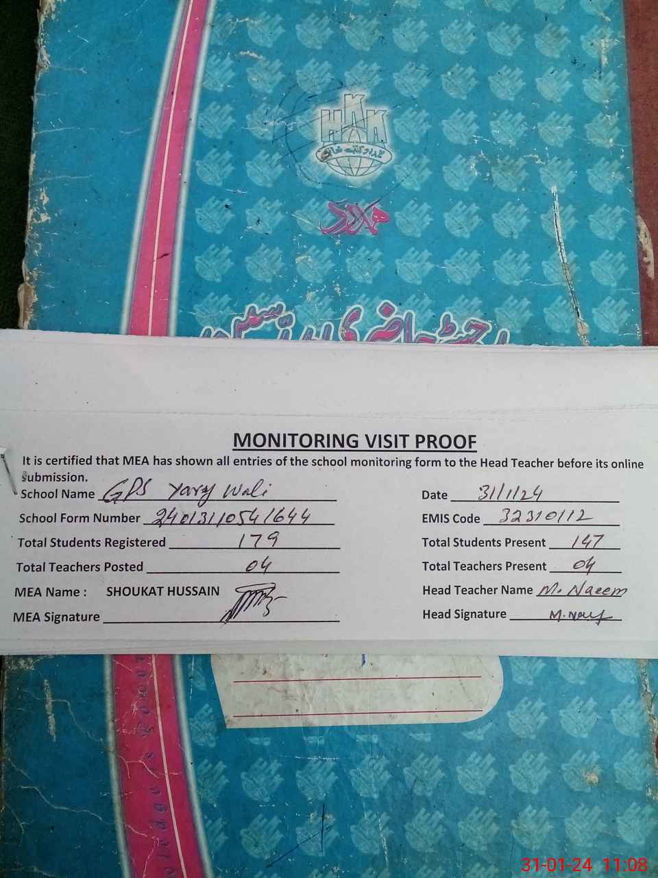 | Attendance Register | Head Teacher | MEA with School | Visit Proof |