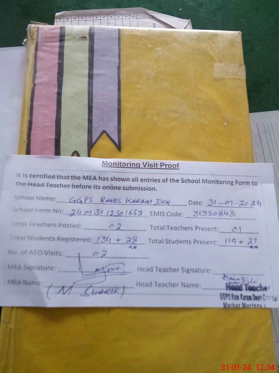 | Attendance Register | Head Teacher | MEA with School | Visit Proof |
