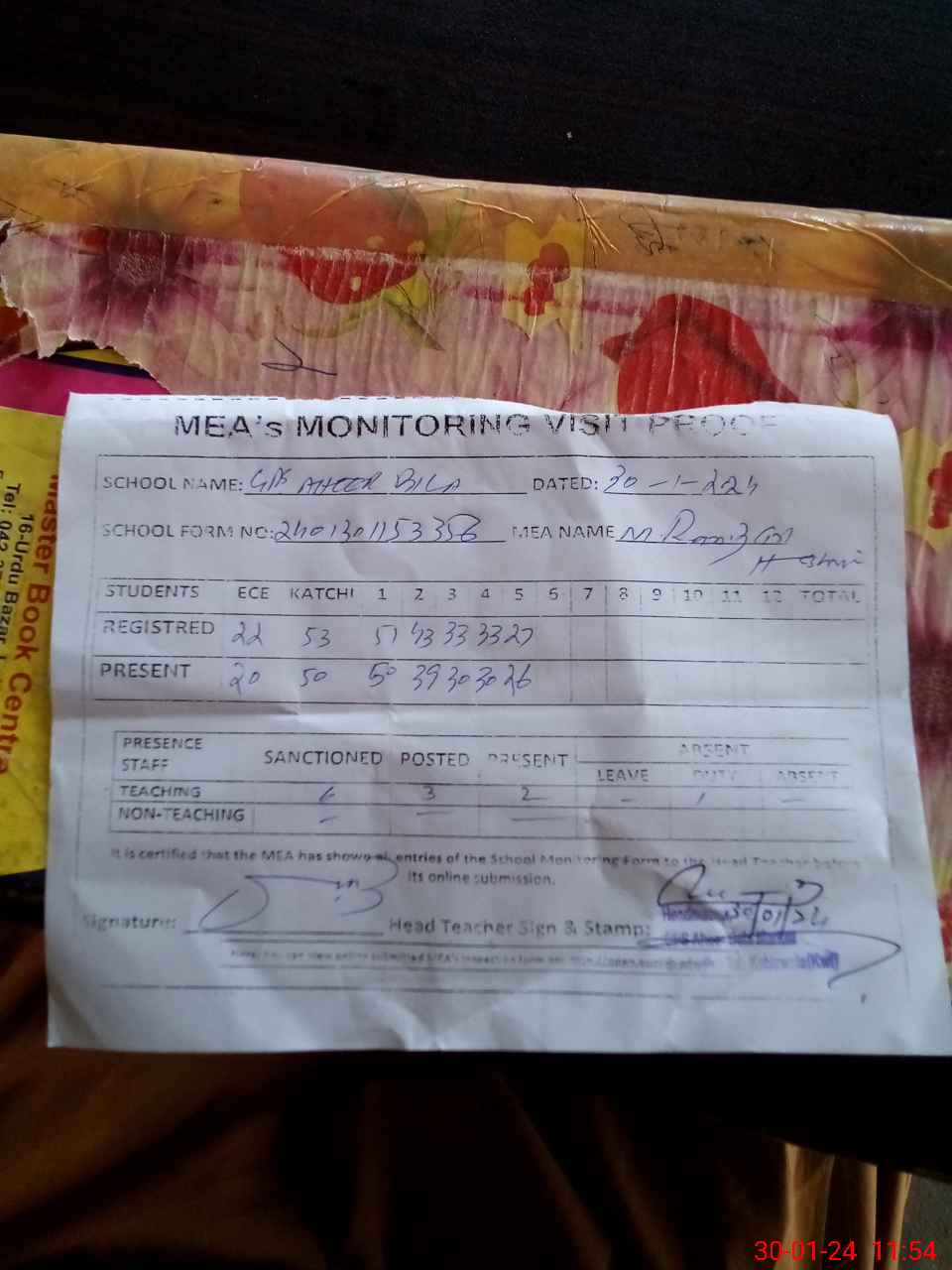 | Attendance Register | Head Teacher | MEA with School | Visit Proof |