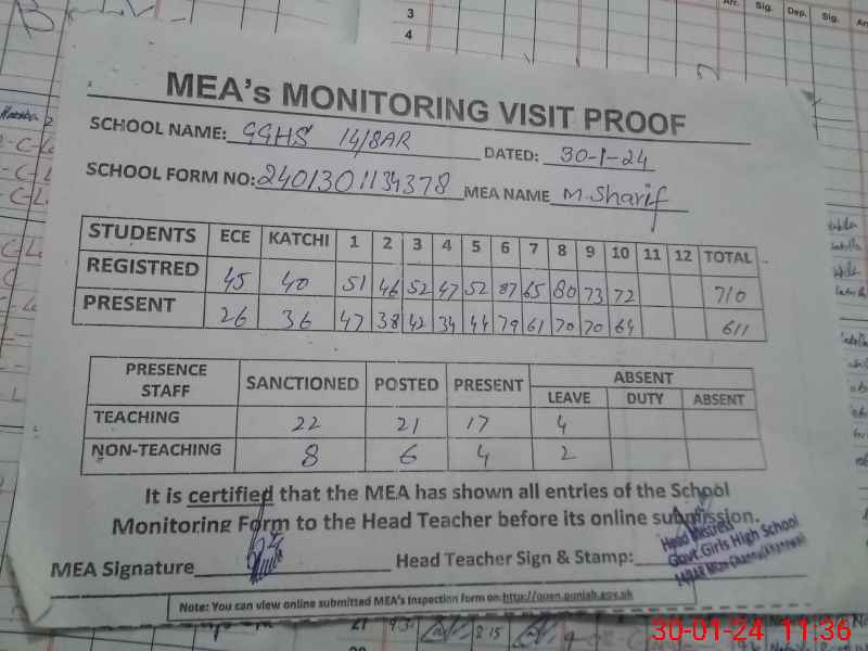 | Attendance Register | Head Teacher | MEA with School | Visit Proof |