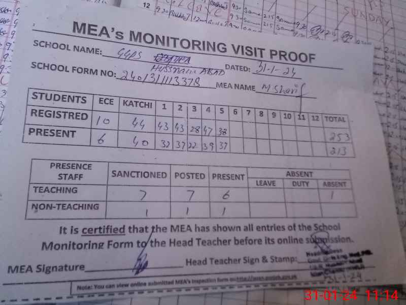 | Attendance Register | Head Teacher | MEA with School | Visit Proof |