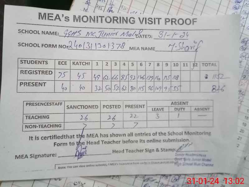 | Attendance Register | Head Teacher | MEA with School | Visit Proof |