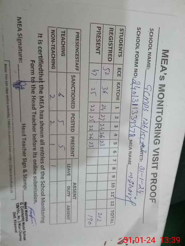 | Attendance Register | Head Teacher | MEA with School | Visit Proof |