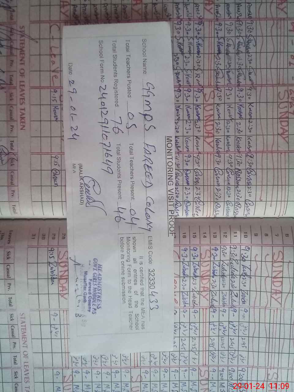 | Attendance Register | Head Teacher | MEA with School | Visit Proof |
