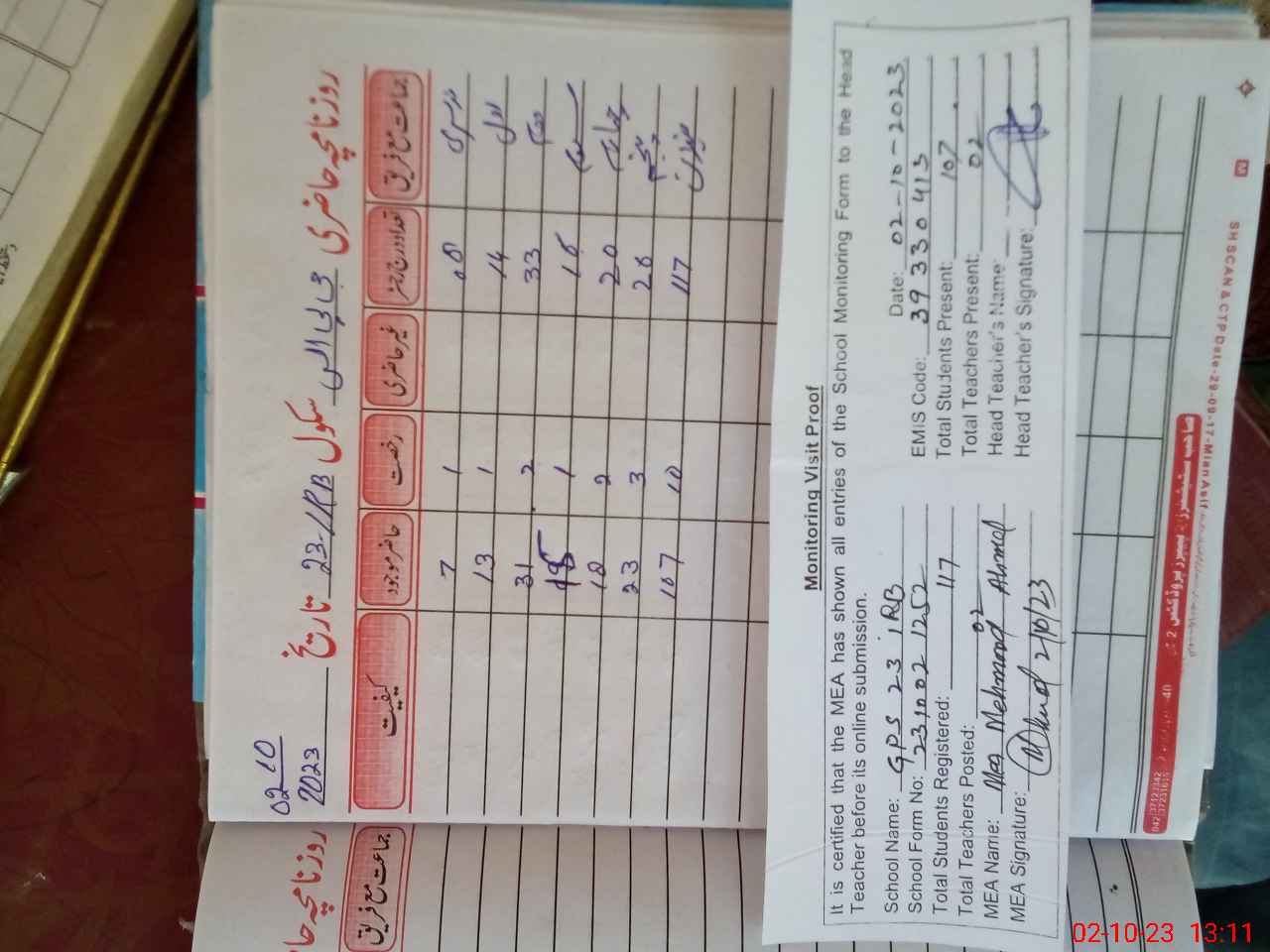 | Attendance Register | Head Teacher | MEA with School | Visit Proof |