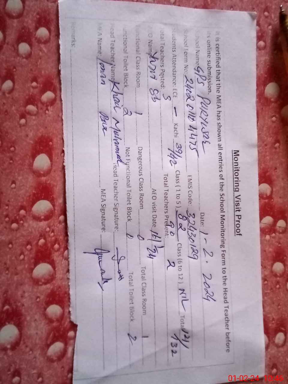 | Attendance Register | Head Teacher | MEA with School | Visit Proof |