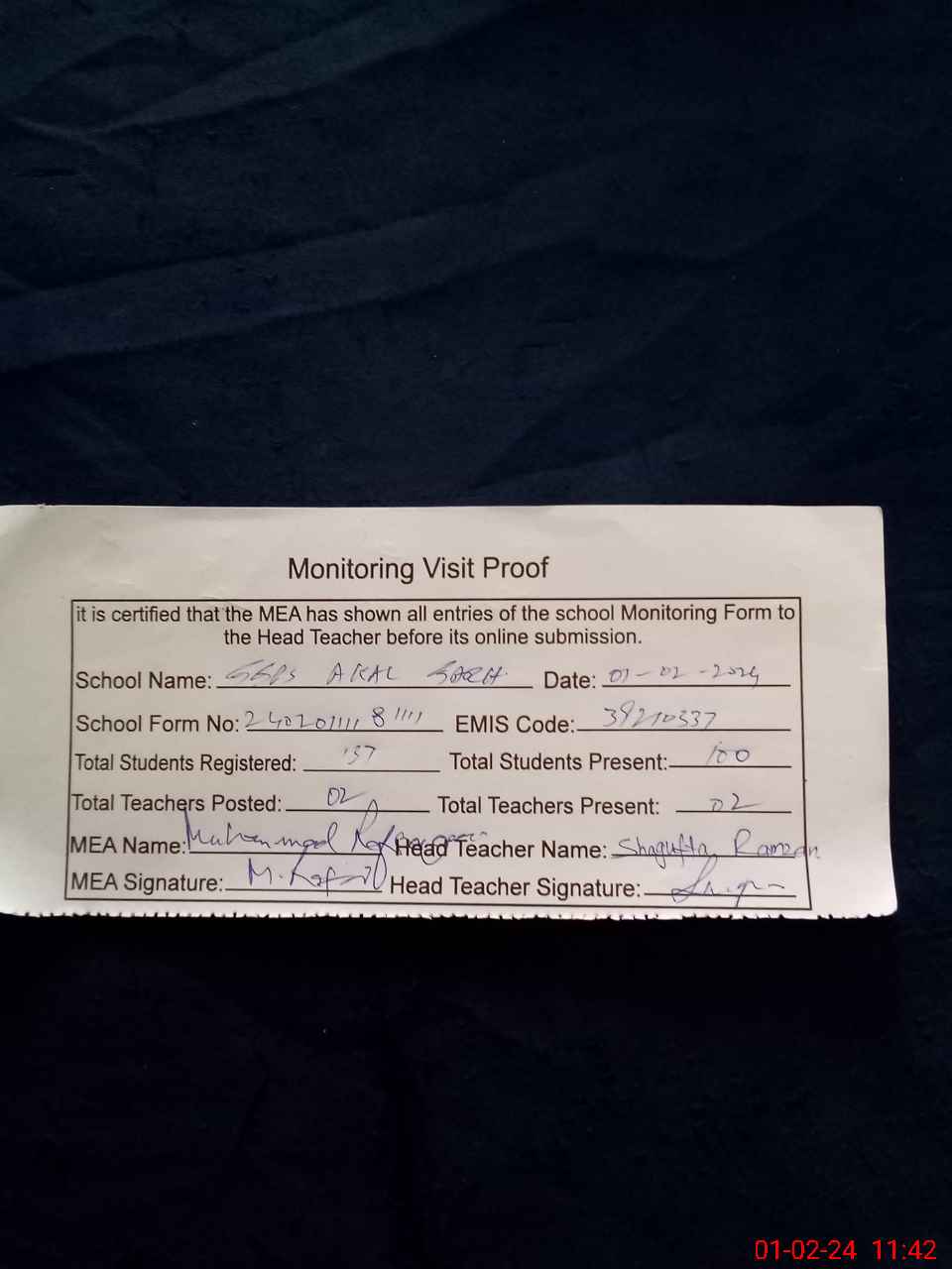 | Attendance Register | Head Teacher | MEA with School | Visit Proof |