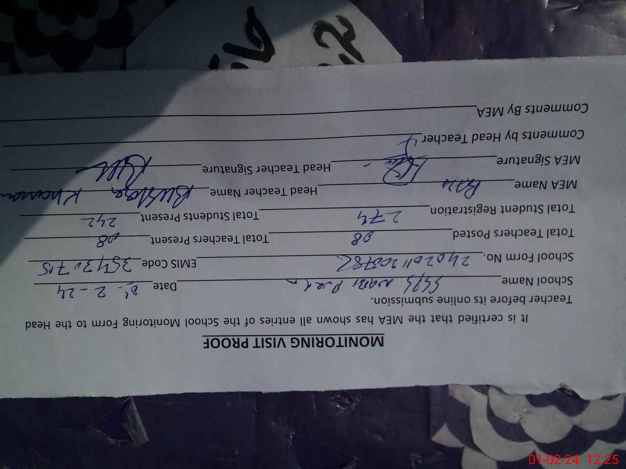 | Attendance Register | Head Teacher | MEA with School | Visit Proof |