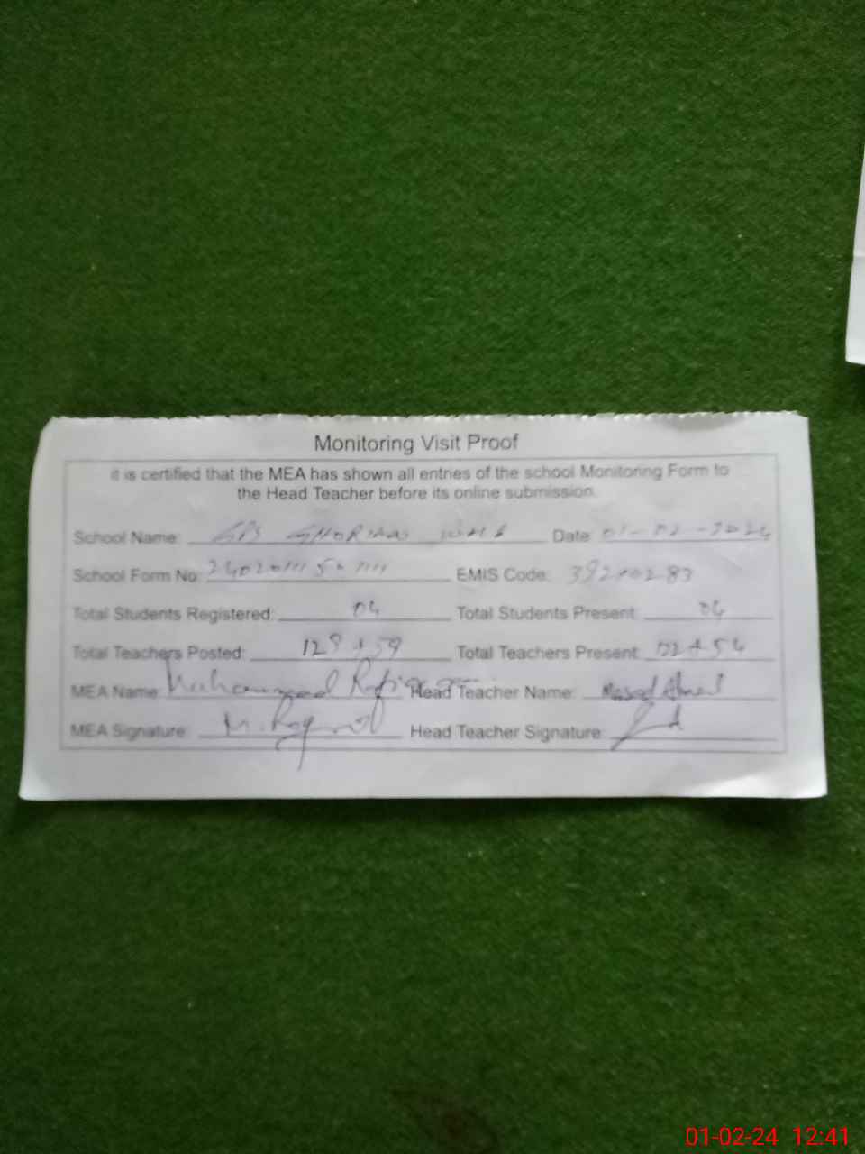 | Attendance Register | Head Teacher | MEA with School | Visit Proof |