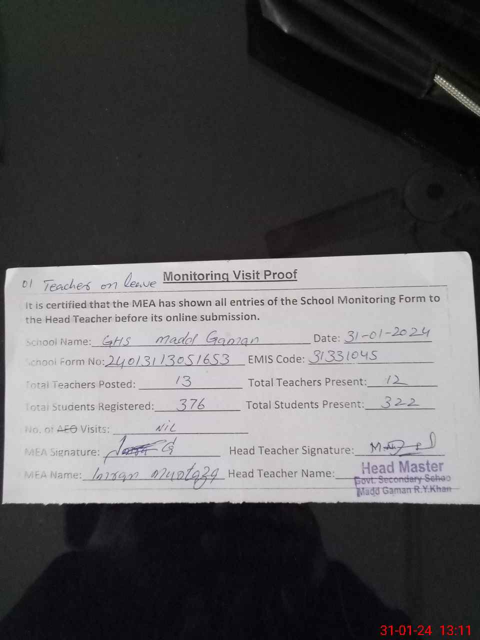 | Attendance Register | Head Teacher | MEA with School | Visit Proof |