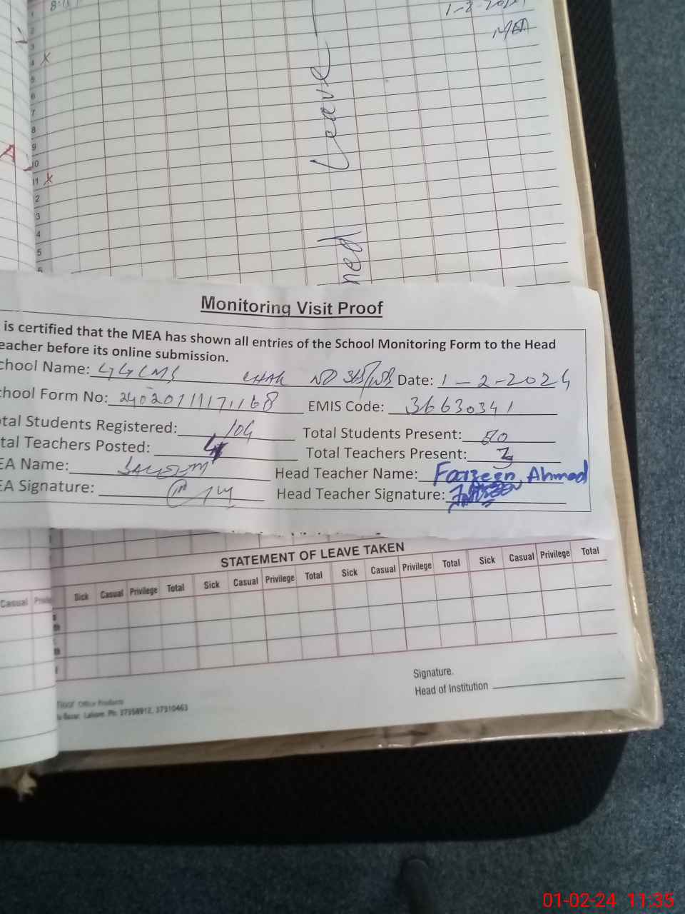 | Attendance Register | Head Teacher | MEA with School | Visit Proof |