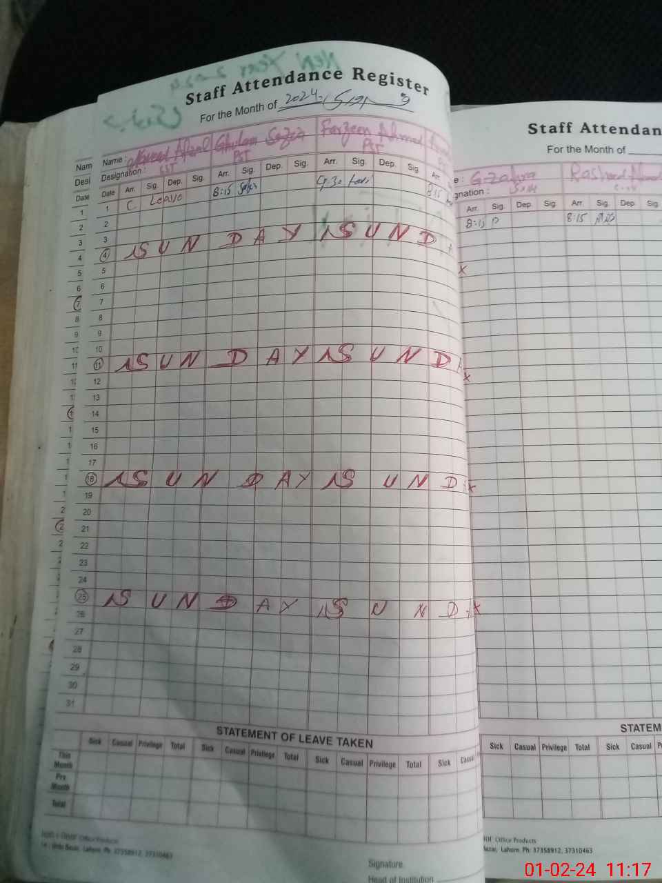| CNIC | Full Name | Designation | R/C | Absence During Last Calender Month |