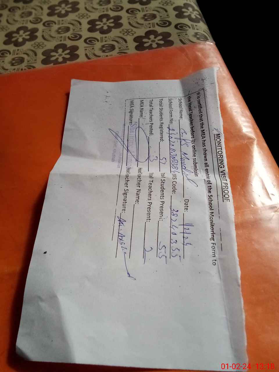 | Attendance Register | Head Teacher | MEA with School | Visit Proof |
