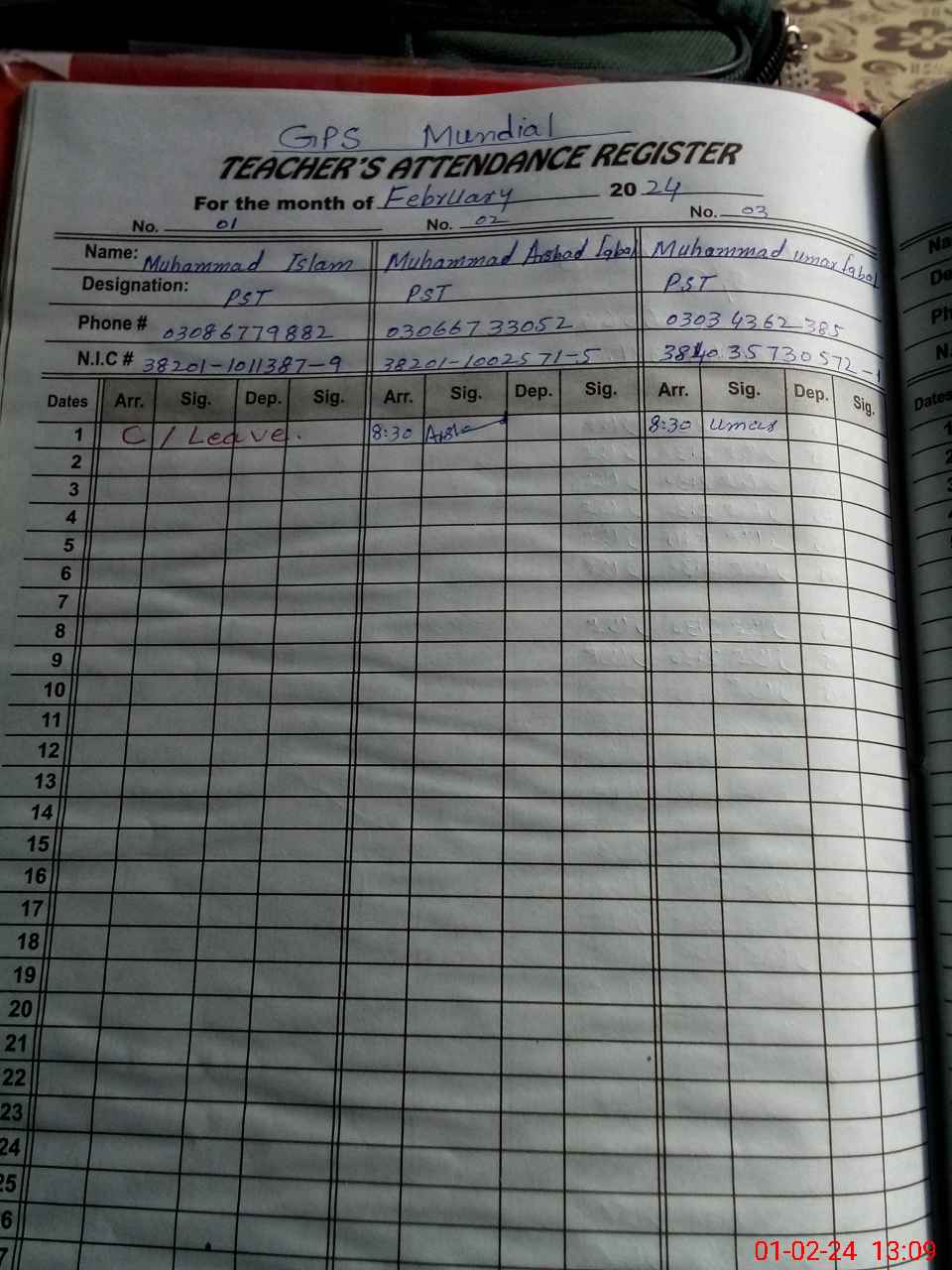 | Name: MU**** IS**** Designation: (School Headmaster's/Headmistress's) PST Phone/Cell Number: 03**** |