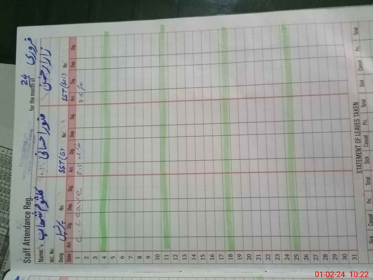 | CNIC | Full Name | Designation | R/C | Absence During Last Calender Month |