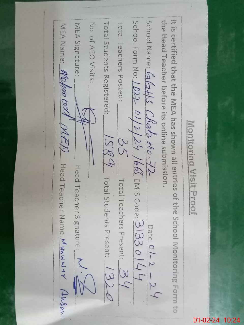 | Monitoring Date: 01-02-2024 | Start Time: 01-02-2024 09:33 AM | End Time: 01-02-2024 10:25 AM | Name of MEA: Ma**** UlHa**** | |