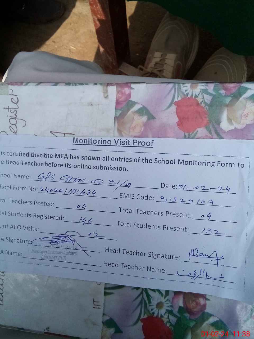 | Attendance Register | Head Teacher | MEA with School | Visit Proof |