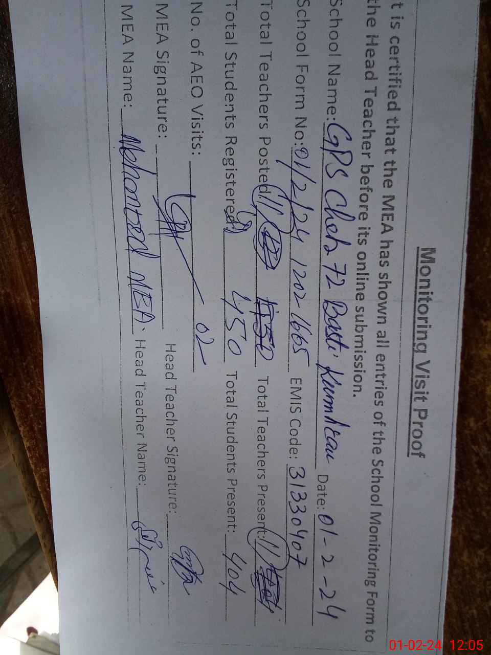 | Attendance Register | Head Teacher | MEA with School | Visit Proof |