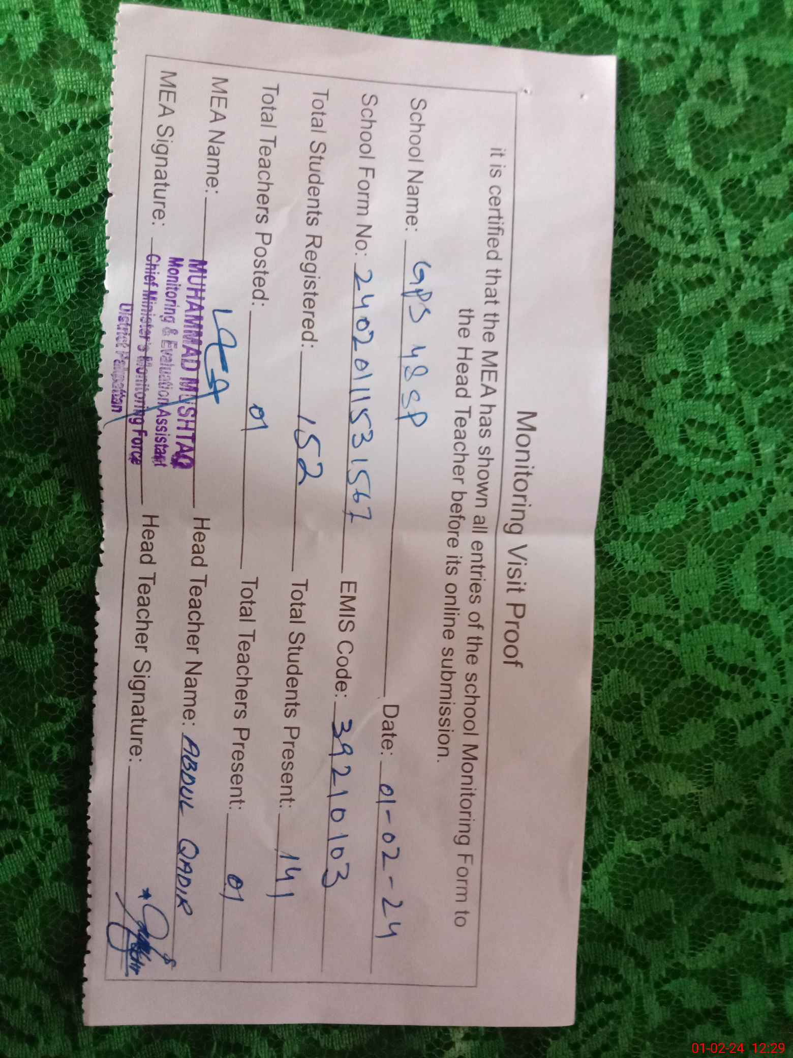 | Attendance Register | Head Teacher | MEA with School | Visit Proof |