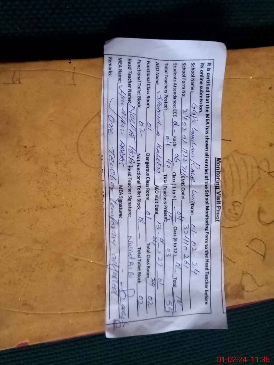 | Attendance Register | Head Teacher | MEA with School | Visit Proof |