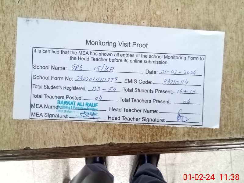 | EMIS Code: 39210114 | Name of School: GPS CHAK NO 15 KB | |||