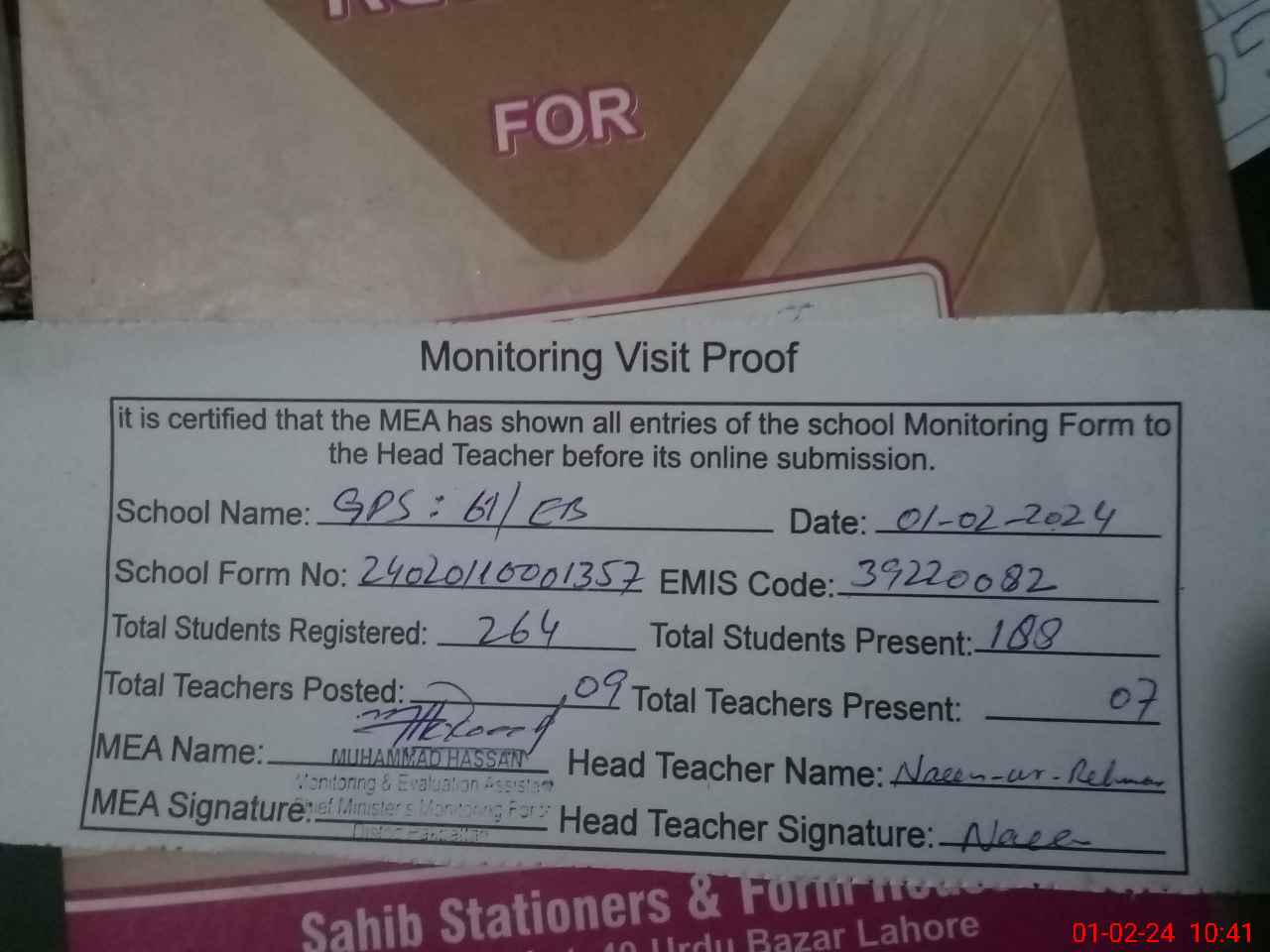 | EMIS Code: 39220082 | Name of School: GPS 61/EB L- BLOCK | |||