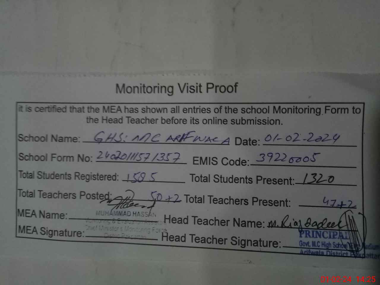| EMIS Code: 39220005 | Name of School: GHS MC ARIF WALA | |||