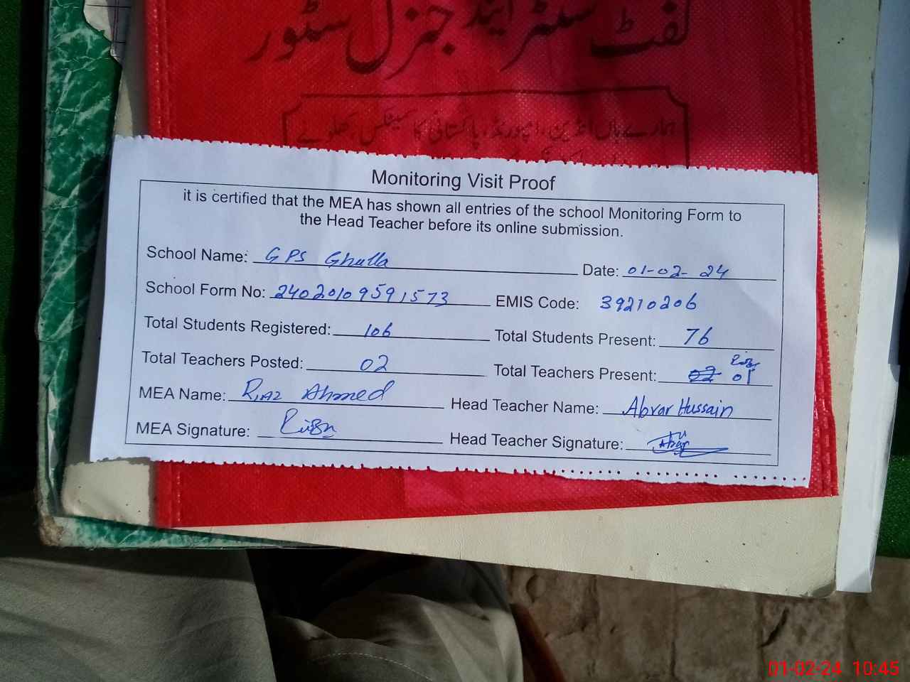 | EMIS Code: 39210206 | Name of School: GPS GHULLA P/O PAKPATTAN | |||