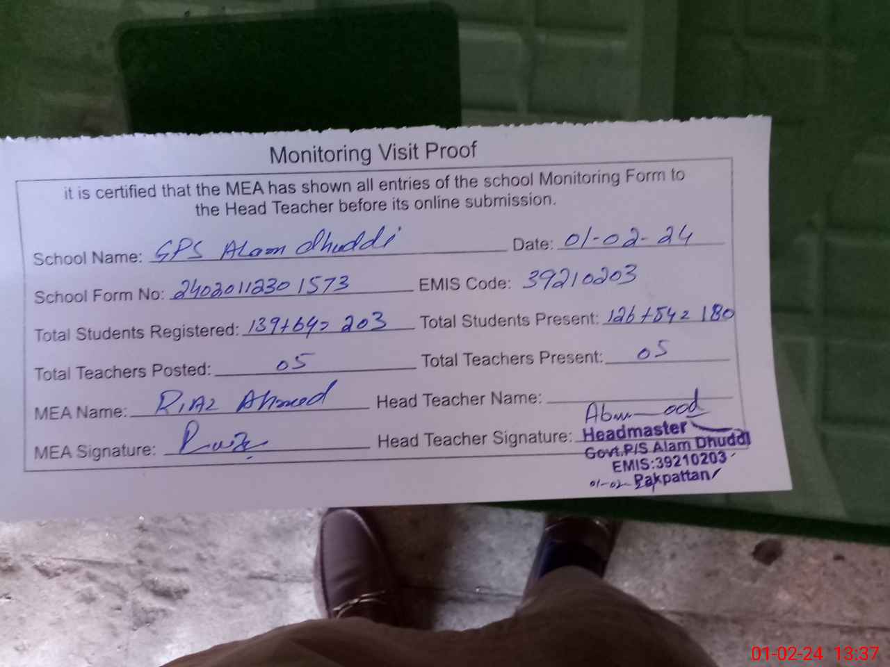 | Attendance Register | Head Teacher | MEA with School | Visit Proof |