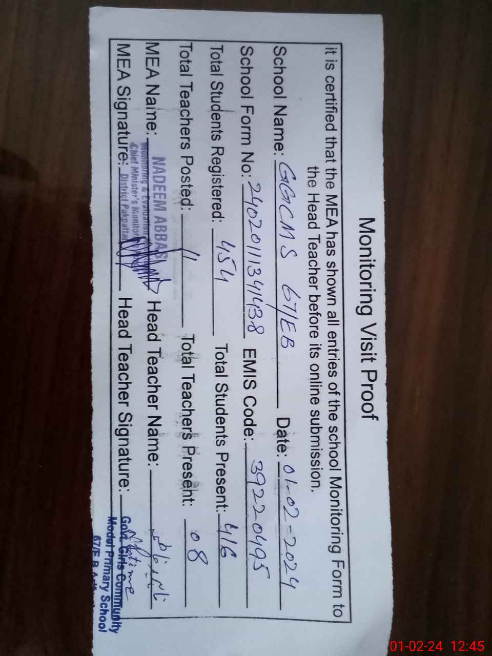 | Attendance Register | Head Teacher | MEA with School | Visit Proof |