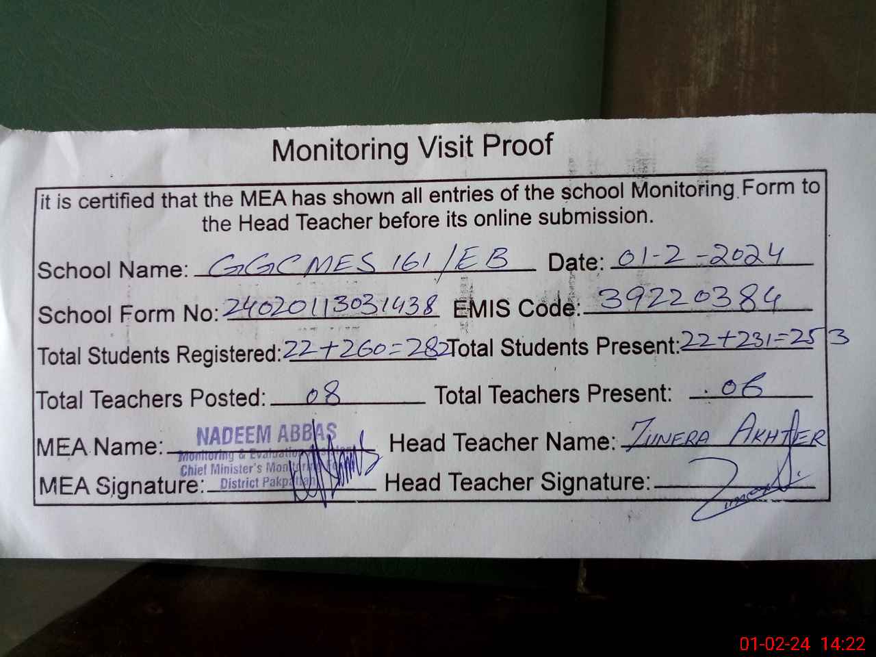 | EMIS Code: 39220384 | Name of School: GGCMES 161 EB ARIFWALA | |||