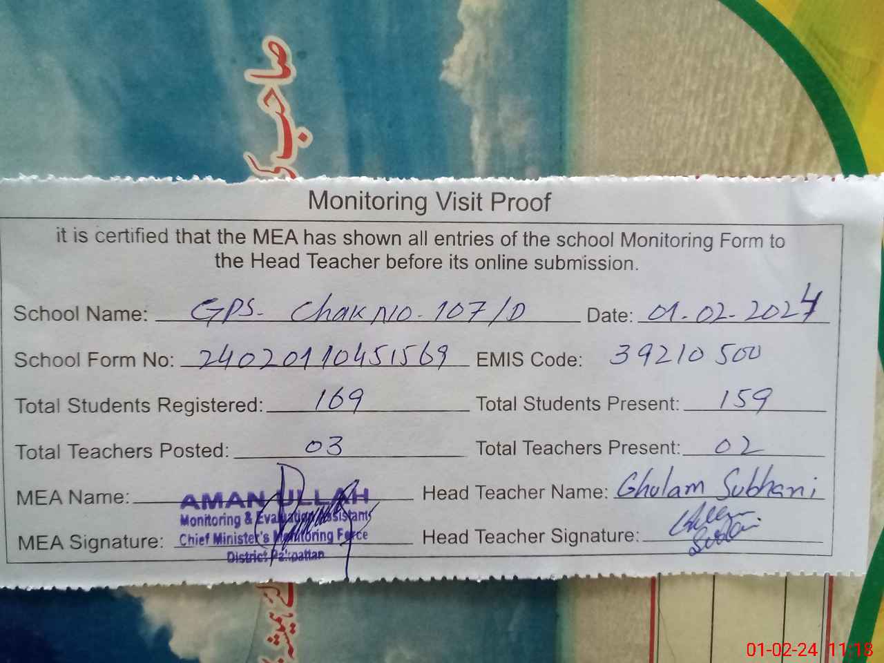 | EMIS Code: 39210500 | Name of School: GPS CHAK NO. 107 /D | |||