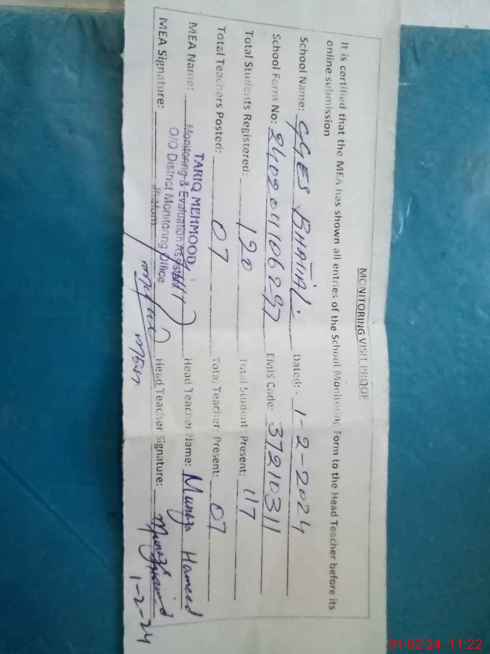 | Attendance Register | Head Teacher | MEA with School | Visit Proof |