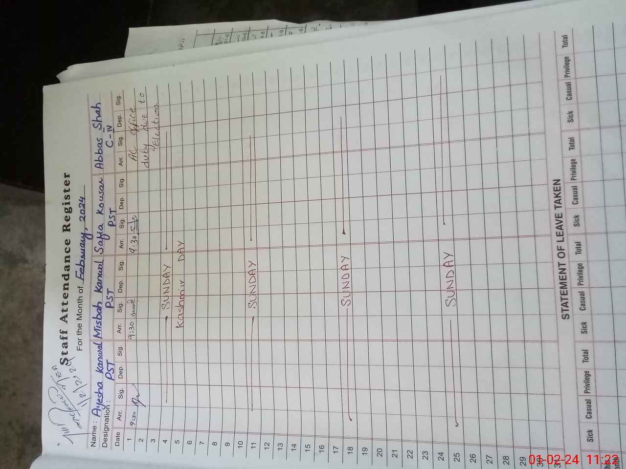 | CNIC | Full Name | Designation | R/C | Absence During Last Calender Month |