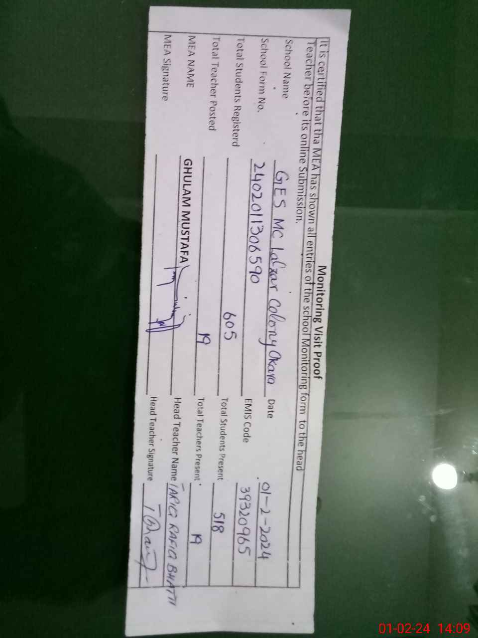 | Certified that this School was Inspected by the Undersigned MEA/DMO Today and the Information Stated Above is as Per Record. | |||||