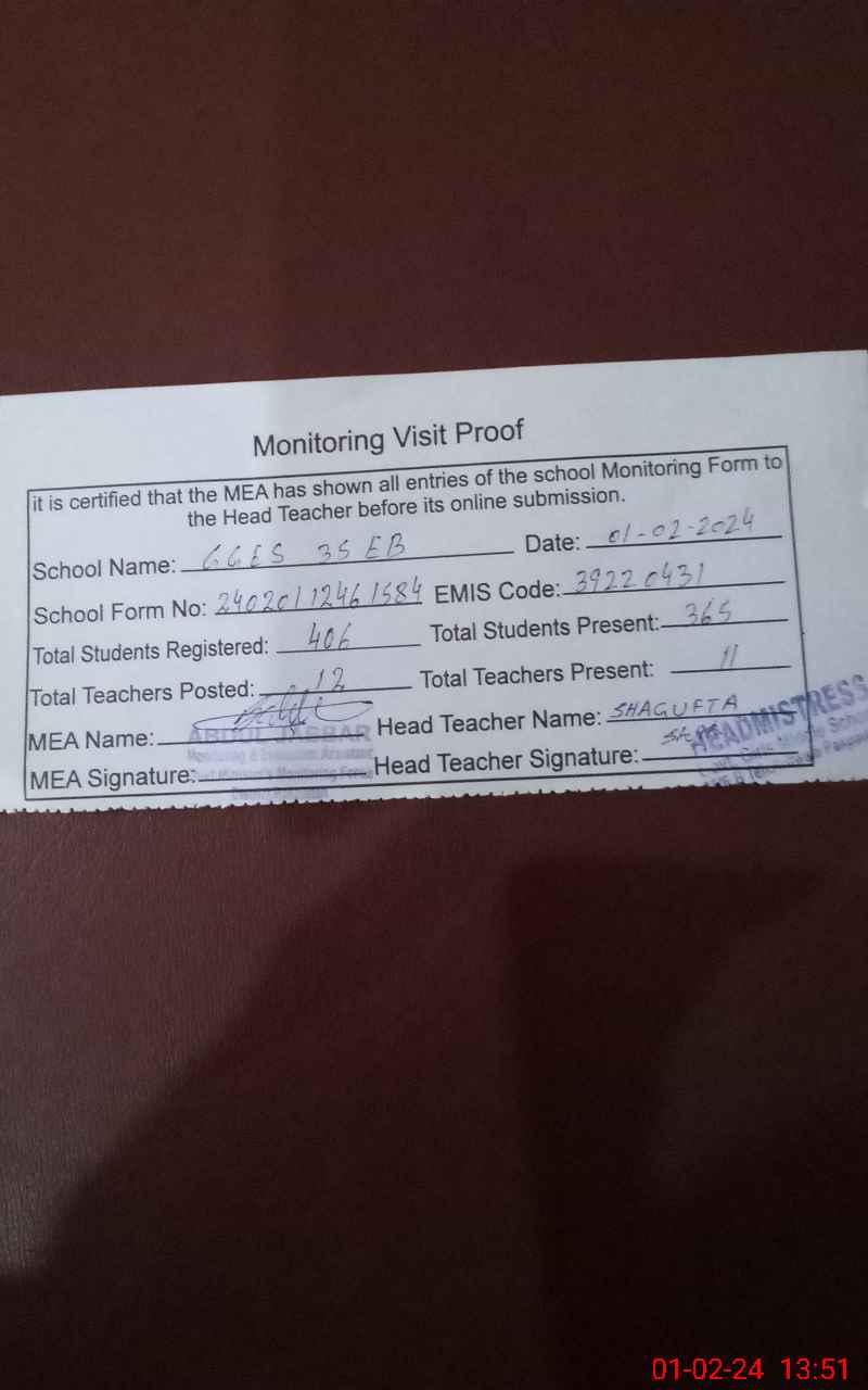 | Attendance Register | Head Teacher | MEA with School | Visit Proof |