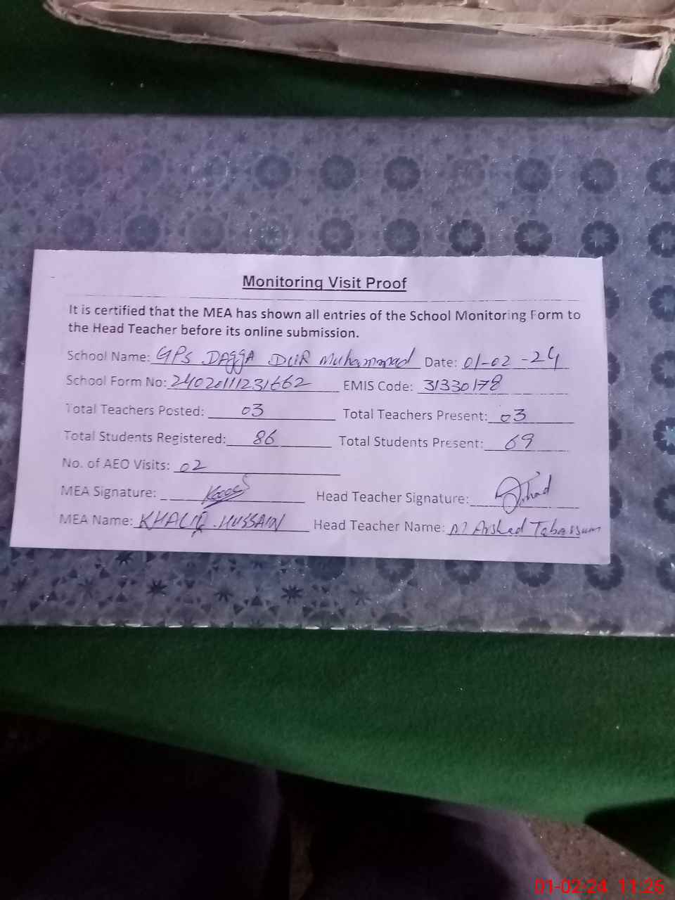 | Attendance Register | Head Teacher | MEA with School | Visit Proof |